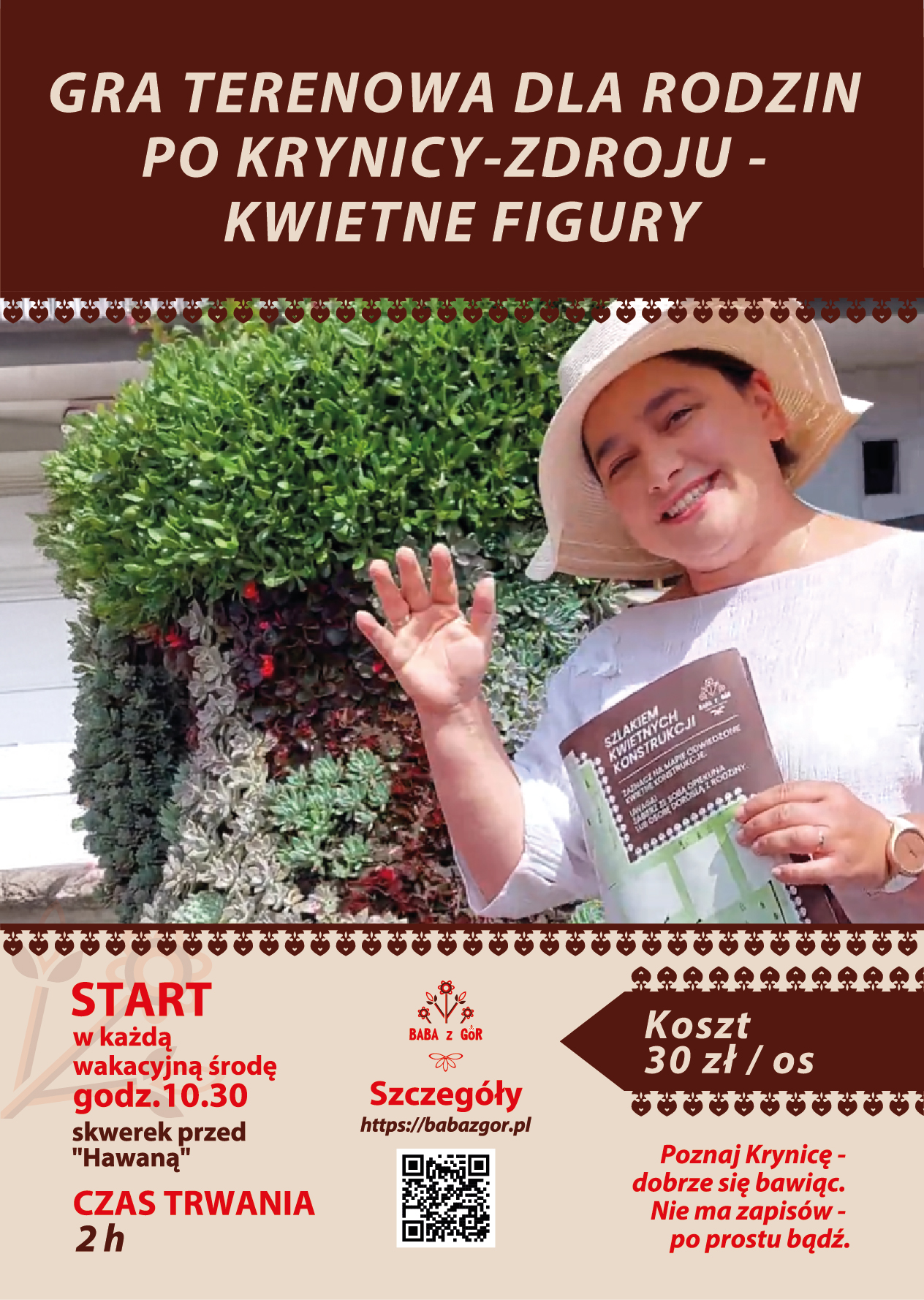 Opis: Serdecznie zapraszam do udziału w grze terenowej po Krynicy-Zdroju W trakcie spaceru poznamy ciekawostki historyczne, sakralne, architektoniczne, a przede wszystkim będziemy się świetnie bawić! Każde dziecko otrzyma mapkę/plan Krynicy-Zdrój oraz naklejki, którymi wypełni grę w trakcie naszego spotkania. Dorośli posłuchają o czym szumi Kryniczanka i będzie czas na indywidualne pytania do przewodnika beskidzkiego – Baby z gór.