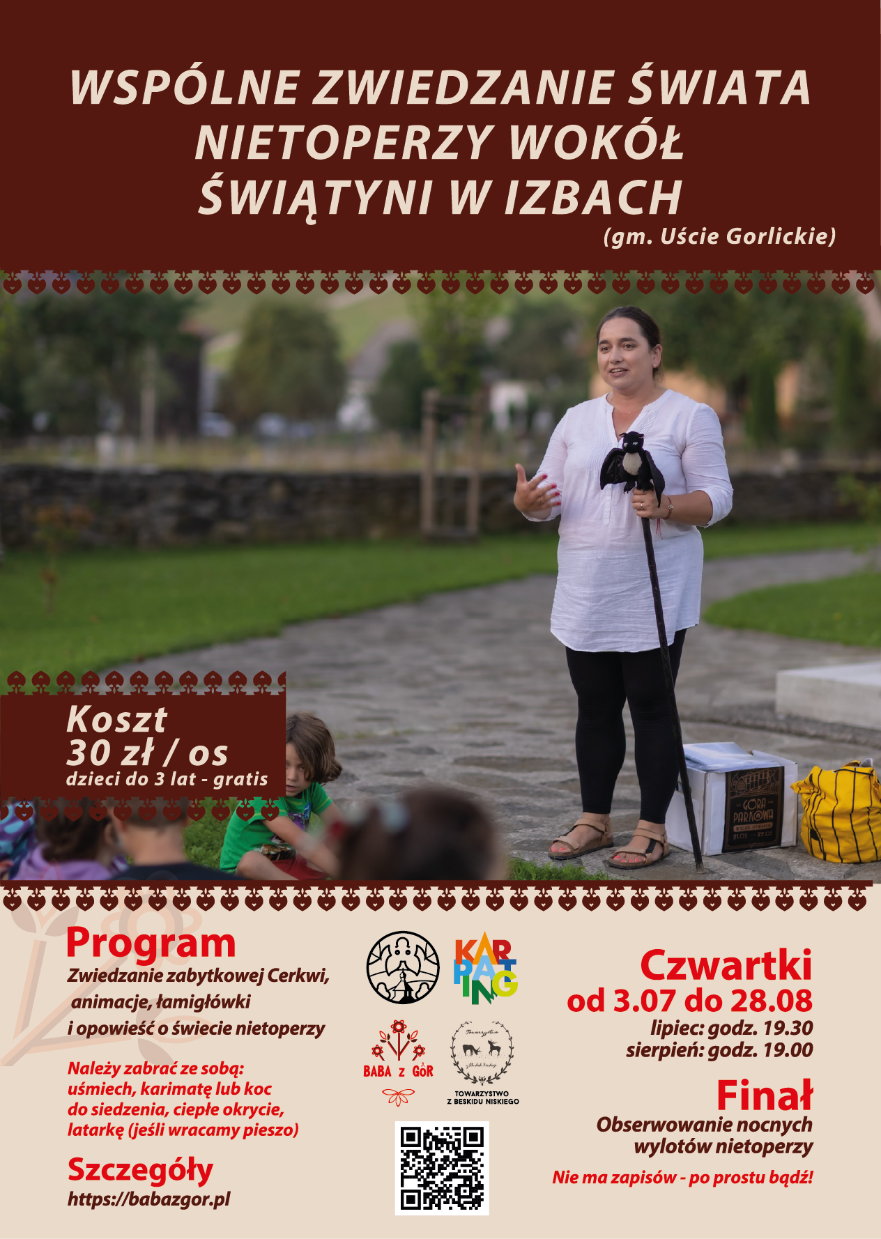 Opis: Serdecznie zapraszam na spotkanie w którym połączymy opowieści o ludziach, architekturze i przyrodzie w lekkiej wakacyjnej formie. Spotkanie rozpoczniemy od zwiedzania zabytkowej świątyni (dawnej cerkwi greko-katolickiej). Czas trwania zwiedzania: 15 minut (taki mi dzieci dają limit; mieszczę się w tym czasie!). Następnie przejdziemy na łąkę wokół świątyni i przez około 45 minut będziemy w wakacyjnym klimacie edukacyjnym poznawać świat nietoperzy. Wspólnie rozwiążemy łamigłówki, zaśpiewamy piosenkę, założymy na czas spotkania nietoperzowe rekwizyty, poznamy pluszową drużynę nietoperzy i zostaniemy fanami podkowca małego.