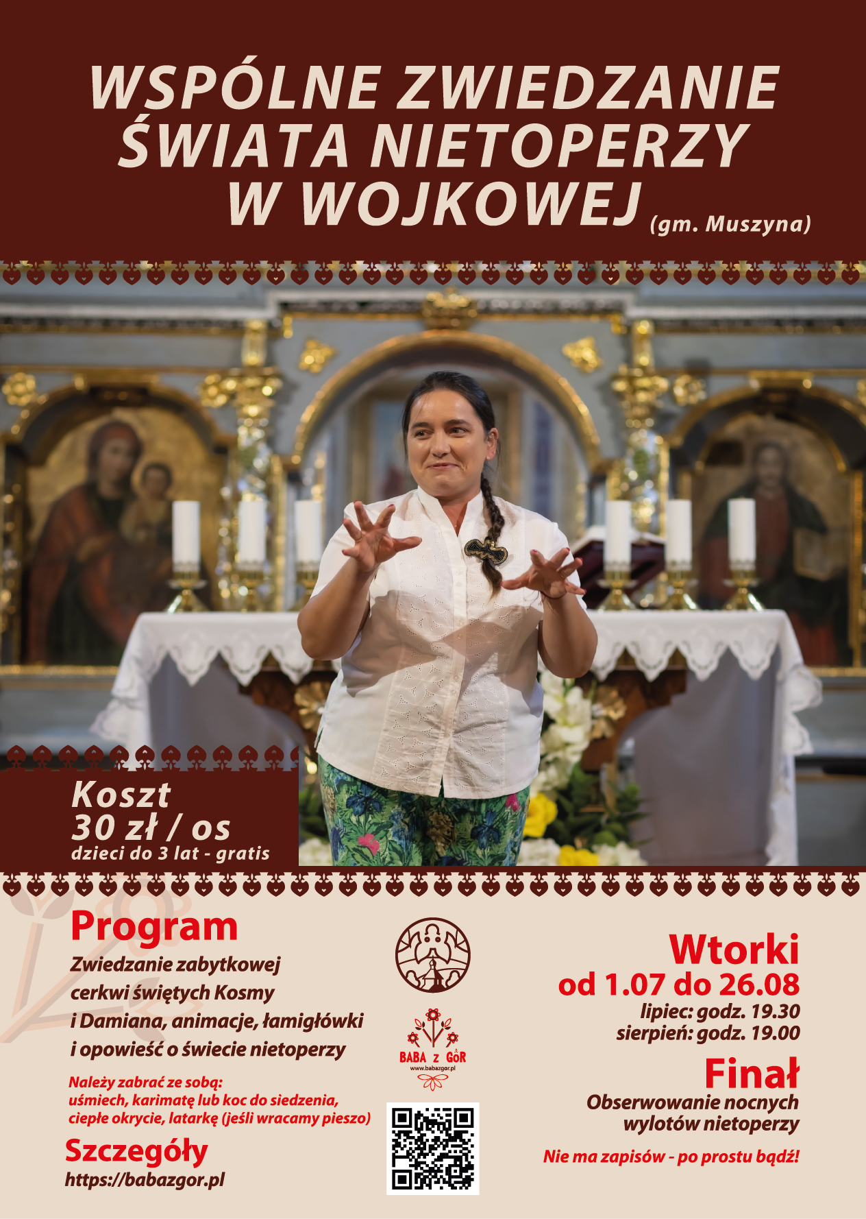 Opis: Serdecznie zapraszam na spotkanie w którym połączymy opowieści o ludziach, architekturze i przyrodzie w lekkiej wakacyjnej formie. Spotkanie rozpoczniemy od zwiedzania zabytkowej świątyni (dawnej cerkwi prawosławnej). Czas trwania zwiedzania: 15 minut (taki mi dzieci dają limit; mieszczę się w tym czasie!). Następnie przejdziemy na łąkę powyżej świątyni i przez około 45 minut będziemy w wakacyjnym klimacie edukacyjnym poznawać świat nietoperzy. Wspólnie rozwiążemy łamigłówki, zaśpiewamy piosenkę, założymy na czas spotkania nietoperzowe rekwizyty, poznamy pluszową drużynę nietoperzy i zostaniemy fanami podkowca małego. Finałem jest bezpieczna obserwacja nocnych wylotów nietoperzy (z poziomu kocyka na łące).