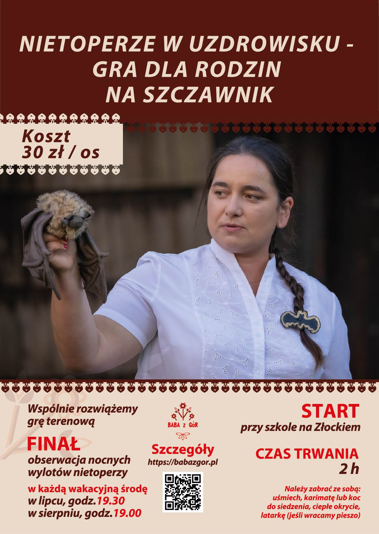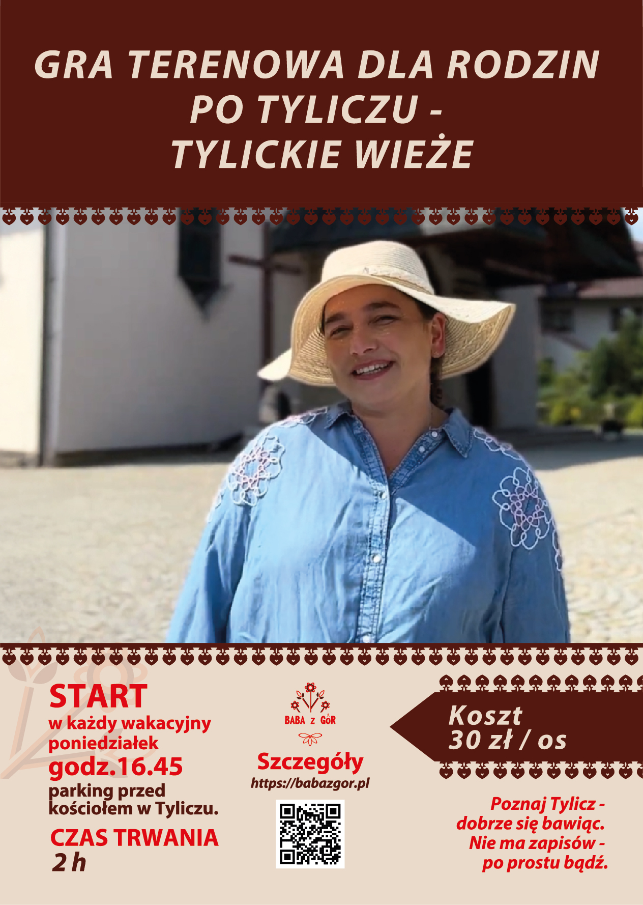 Opis: Serdecznie zapraszam do udziału w grze terenowej po młodym krynickim uzdrowisku. W trakcie spaceru poznamy ciekawostki historyczne, sakralne, architektoniczne, a przede wszystkim będziemy się świetnie bawić! Każde dziecko otrzyma mapkę/plan Tylicza oraz naklejki, którymi wypełni grę w trakcie naszego spotkania. Dorośli posłuchają o czym szumi Muszynka, co wspomina Lackowa i będzie czas na indywidualne pytania do przewodnika beskidzkiego – Baby z Gór.