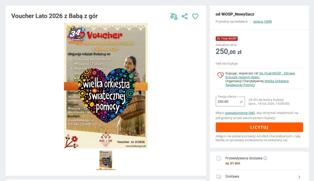 - Link do licytacji: https://allegro.pl/oferta/voucher-lato-2026-z-baba-z-gor-18251123283