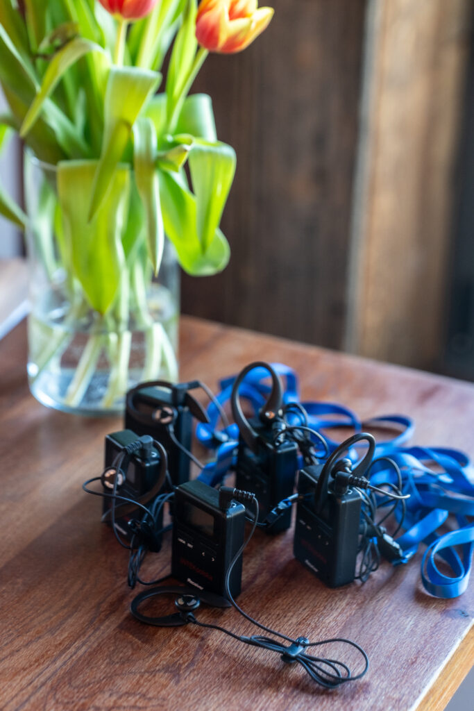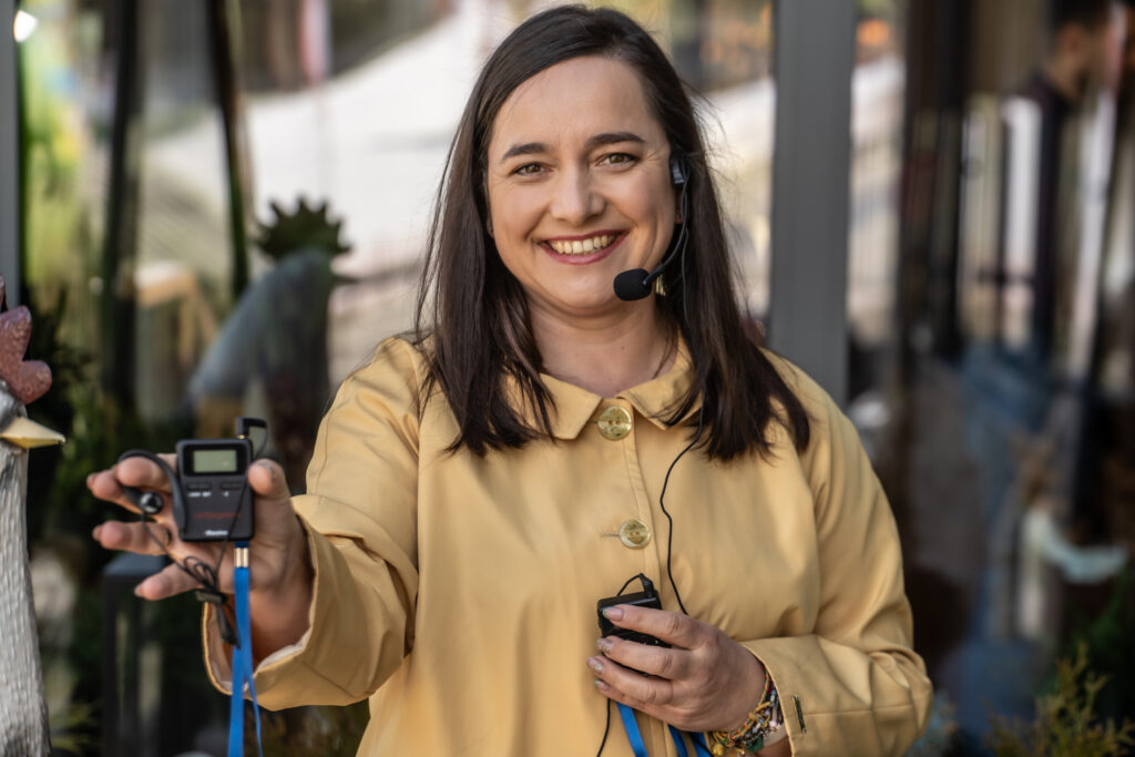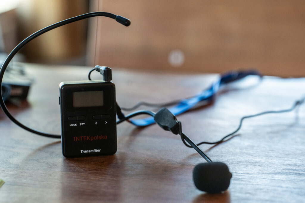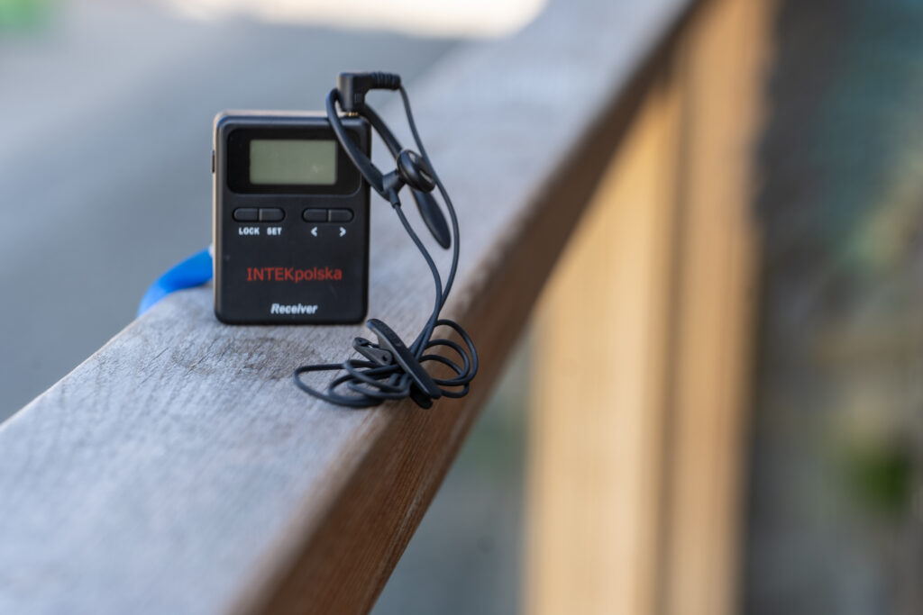 Mam na stanie 50 odbiorników oraz mikrofon dla przewodnika. Baterie wystarczają na cały długi dzień zwiedzania. Ładuje się je przy pomocy specjalnej, dedykowanej temu – walizki.